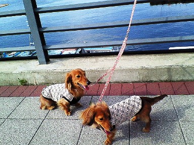 今日はSAKURAとMOMOの実家でもあるブリーダーさん主催のオフ会に行ってきました~ 横浜の室内ドッグランでのオフ会だったのでワンワン言って大変かな~ って思いつつ行ったのですが、やはり集まっているのがダックスオンリーだし親戚のつながりもわかるのかすぐにうちとけお利口に遊べました(たまに追いかけっこに拍車がかかるとガウガウ言ってたけど・・・(^_^;)) そして我が家のSAKURAとMOMOはブリーダーのyukoさんに会うなりもうべったりんこ! 特にMOMOはyukoさんの家の子??っていうくらいくっついて歩いてました~爆 幼少の記憶でしょうか・・・MOMOが一番遊んでたのもyukoさんの家のビジンちゃんでした!! (向かって左がMOMO・右がビジンちゃん) そんなビジンちゃんはSAKURAの姪っこなんですが(SAKURAの異父姉弟の子)以前からSAKURAに似てると思ってたんですが、今日改めて会ったらなんとMOMOにそっくり!!! yukoさん自身も間違えるほどでママもなんども見間違いました~爆 しかし血筋的には遠いのにこんなに似てるMOMOって・・・やっぱりSAKURAに似てるから?爆 そしてブリーダーさんのオフ会なのでもちろんカニンヘンのオフ会・・・ yukoさんのお友達の方がダックスを連れてお手伝いにきていたのでSAKURAの大きさは紛れてましたが、実際同じ犬舎出身の子の中ではダントツでかい!!爆 っていうか長い!!笑 yukoさんのお友達にも「この子長いね~え?カニンヘンなの??」って言われちゃうほど~爆 その分いつもチビち通ってるMOMOがそんなに小さく見えなかった~笑 そして相変わらず人見知りのママは他の方とあまりお話できず・・・ ひたすらワンを観察してにやける変な人?になってました~笑 今日参加されてたワンちゃんはほとんどMOMOを迎えたあとに生まれた子達が多かったです なのでブリーダーさんのHPの出産情報で生まれたときから見てた子達だったからこんなに成長したんだ~って感じでうれしくなって一人感無量状態?爆 (ラルフ君、JIRO君、マフィン君、レオン君、アンジーちゃん、きなこちゃん、そしてyukoさんの家のビジンちゃん、こつぶちゃん、うにちゃん・・・これでみんなかな??見落としてたらごめんなさい~) しかもママが一番生で見たかったのはチョコクリのアンジーちゃんときなこちゃん!! チョコクリが欲しかったママ・・・ ブリーダーさんのところでチョコクリが生まれるのはめずらしく、生まれたときはかなり欲しかった~ しかしMOMOはすでにいたからね~笑 しかもきなこちゃんは生まれたときからビターチョコ系でタンもさほど派手ではなかったからお気に入りだったんだ~ 1度だけ小さい頃見せてもらってたので「いい飼い主さんと巡り会うんだよ~」って涙を呑んだあの子・・・ きなこちゃんとアンジーちゃんの飼い主さんはとってもいい人そうで幸せそうな2ワンを見てうれしかったです! しかもやはり幼少期の記憶なのかアンジーちゃんときなこちゃんはとっても楽しそうに2ワンでじゃれあって遊んでました~ そんな風景を見つつyukoさんの家の今後が期待大のキンキちゃんの子供のうにちゃんをどうやって拉致るか考えてみたり・・・爆 ちっちゃくて可愛くて気付くと抱っこしちゃいました~笑 あと不思議と今日はSAKURAに乗っかる子がいませんでした 親戚ってわかるのかな?? って乗ろうとするとSAKURAが怒って近づけなかった?? SAKURAが怒るって今日はSAKURAにとって年下ばっかりだからかしら? やたら年上風を吹かしてみんながかけっこをしてると「走るな~」って怒ったり・・・感じ悪いよ~SAKURAさん・・・(;一_一) あとyukoさんのお友達でこつぶちゃんとうにちゃんのパパでもあるEchten Wiese (エヒテンヴィーゼ)さんのソラ君を生で見てホントきれいなドイツ系カニンヘンで感動しちゃいました~ さすがチャンピオン!!って感じでした~ そんなこんなでランチを頂き、その後、早食い競争、障害物競走、仮装大会、かけっこ競争をしたりととっても楽しく時間を過ごすことができました(早食いとかけっこはさすがのウマックスSAKURAさんがいい順位を~爆) そして今日2ワン連れは我が家のみ・・・ しかもやたら仲良しのSAKURAとMOMO・・・ 障害物競走ではSAKURAを出したつもりが一緒にMOMOまでついてきてやってるし・・・ 仮装大会では写真を撮るのに全く同じ視線のやり方するし・・・爆 外ではホント仲良しだよね~ 気付くとあんまり夢中でワンコ観察をしてたから写真をあまり撮ってない・・・ しかも唯一撮ってる写真もブレまくり・・・(-_-;) またブリーダーさんのHPに写真アップされるのに期待~爆 そして競技でたくさん賞品をもらったにも関わらずお土産もたくさん頂いて・・・(びっくりするほどたくさんありました~) Yukoさんのお気遣いに感謝するとともにお手伝いに来ていただいてたyukoさんのお友達の皆様にも感謝感謝のオフ会になりました~ そして帰りは少し時間があったのでそのまま歩いて山下公園~赤レンガ付近~みなとみらい付近をお散歩してそのまま横浜まで歩こうと思ったけど道がわからず結局桜木町から電車に乗って帰ってき
